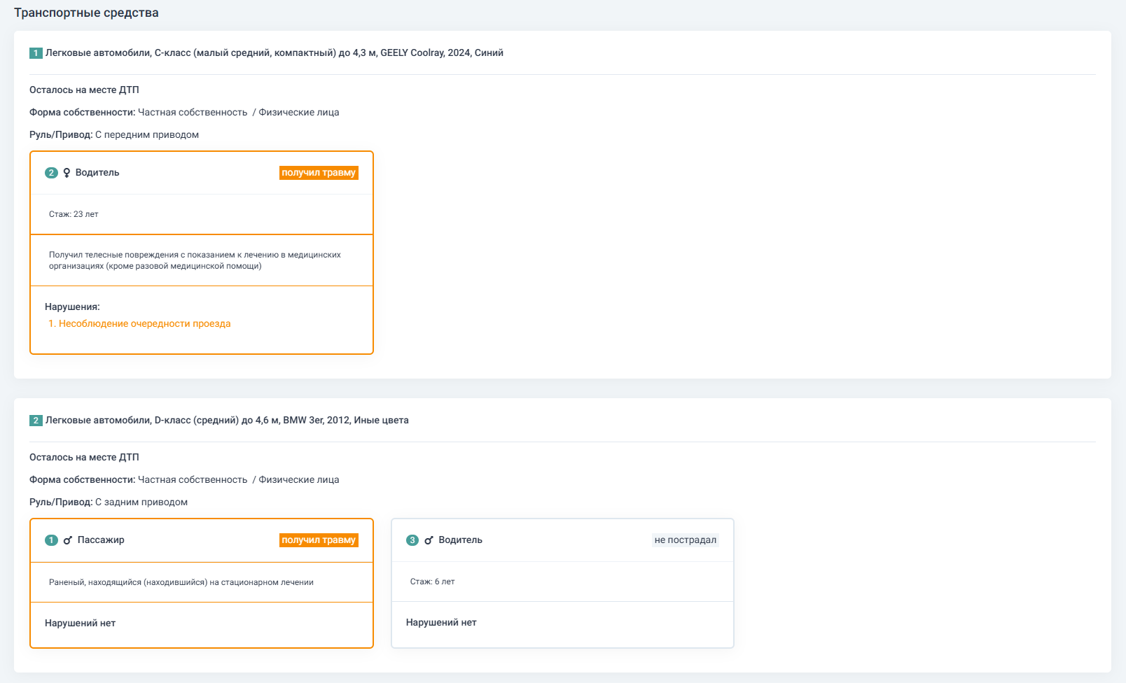 В карточке транспортного средства теперь отражается статус оставления места ДТП, а также обновлены пиктограммы, обозначающие пол участника.